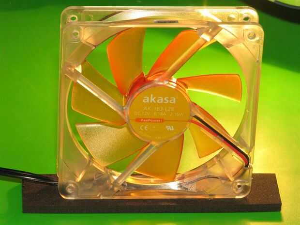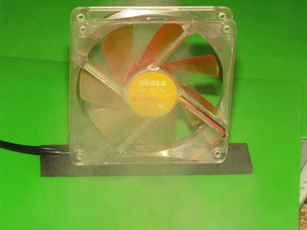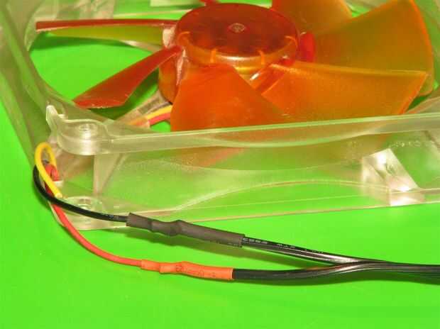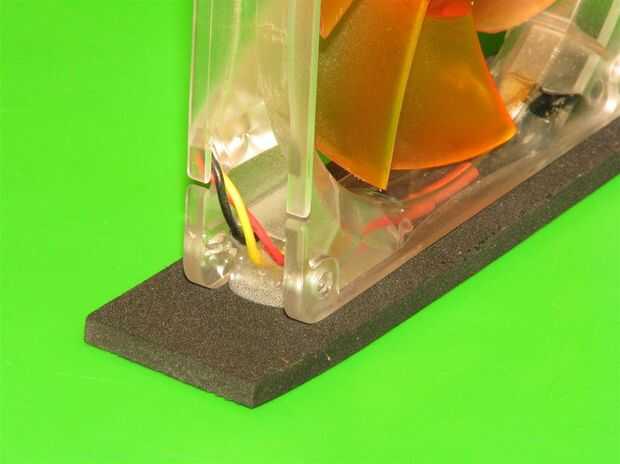 Armando el dispersor no podía ser más fácil - sólo la soldadura el positivo al cable rojo y el cable negativo al negro. Use cinta o termo retráctil para aislar los empalmes y recorte los cables innecesarios. Cortar la espuma lo suficientemente grande como para proporcionar una base estable. Esto también reduce ruido y vibración. Los cables bajo el ventilador y pegar el ventilador a la base con pegamento caliente.