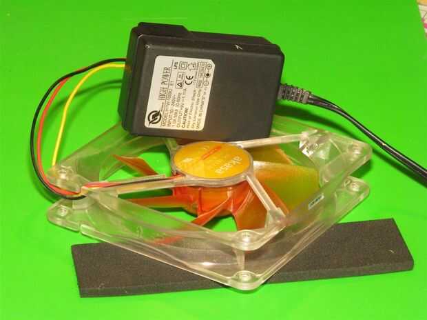 Todo el mundo tiene un par de repuesto tomacorrientes alrededor y un 9V uno es ideal para esto ya funciona el ventilador de 12 voltios a una velocidad adecuada y será más tranquilo que el plano de ejecución. El positivo casi siempre irá al Consejo o centro de contacto del conector. También se identificarán por una raya blanca o una cresta a lo largo del cable.