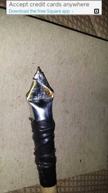 Inicialmente fui goin para cortar una forma de una cabeza de flecha y usar algún tipo de epoxi o pegamento fuerte para pegar los bordes de corte cerrados.