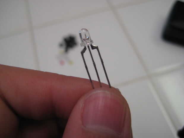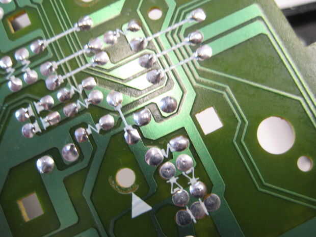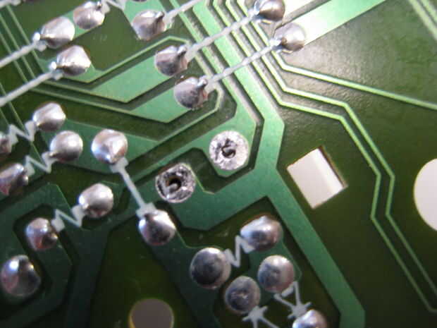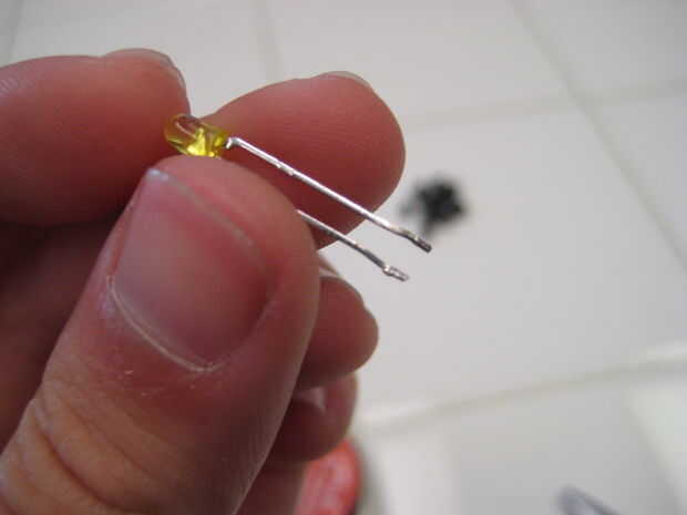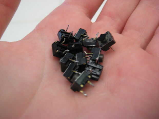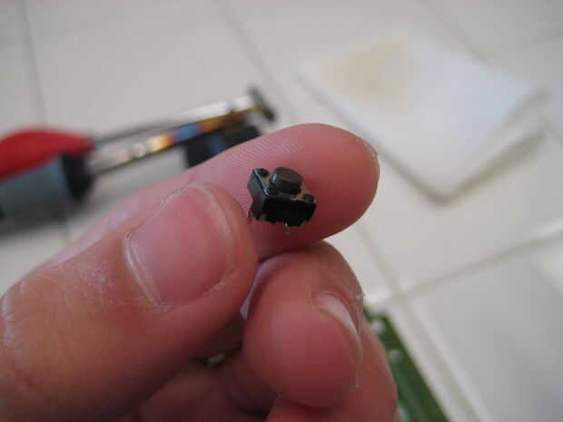 Una vez aspirado suficiente soldadura, romper el agujero con los cables, luego extraer el componente. En las fotos, estoy para desoldar un interruptor del tacto de un estereo viejo. Tuve suerte de tener interruptores con sólo dos cables.