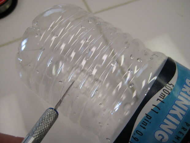 Usando un cuchillo x acto, corte la parte inferior de la botella de agua, a partir de 3 o 4 golpes para arriba. Pila de tres para crear un conjunto. Repita esto tantas botellas de agua como quieras.