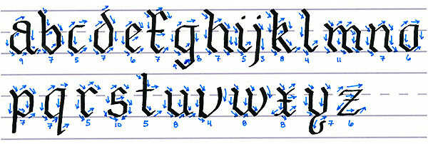 - Letras se escriben con una o varias pasadas. Usted puede encontrar alfabetos caligrafía educativo, indicando el orden y la dirección de los trazos. Como este