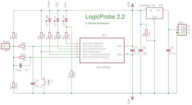 El LogicProbePIC se basa en un PIC12F629 y utiliza un regulador de voltaje LDO de LM2936.