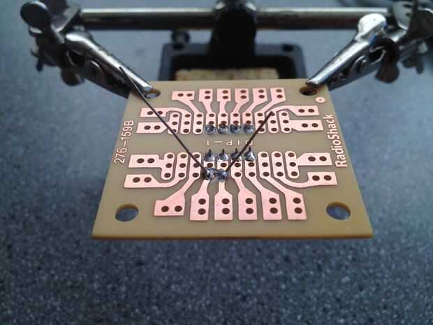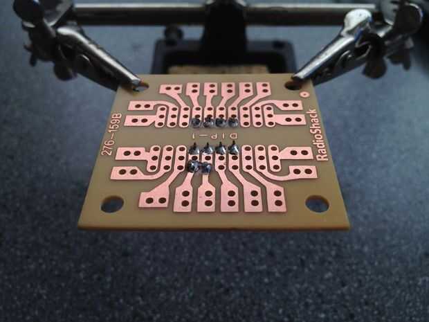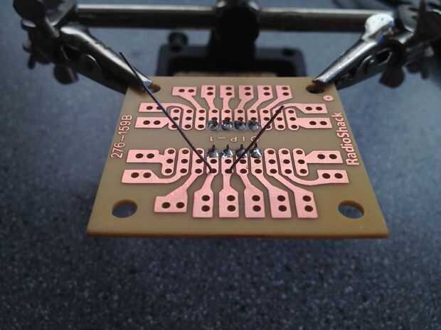 si usted está tratando de soldar componentes por-agujero con cables largos en un PCB, aquí está un sencillo Consejo que mantendrá en su lugar mientras la placa está al revés y plomo y cojín.  Sólo tiene que colocar el componente donde quieras y en la parte inferior del tablero, doblar las puntas agudamente a los lados.  El ángulo no debe ser demasiado grande, pero es importante que la curva abrupta.  Queremos un ángulo, no una curva.  Me parece la forma más sencilla de hacerlo es presionando ya sea el plomo con la uña en su base, o utilizando un par de alicates.  Después de que los cables están doblados, el componente permanece en su lugar cuando le da la vuelta el tablero boca abajo para soldar y cortar el exceso lejos.