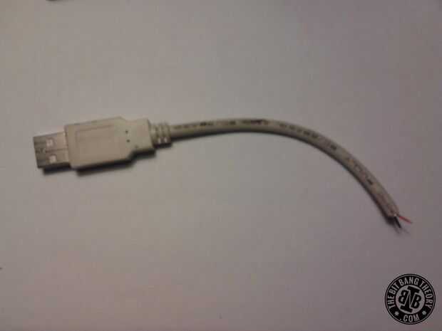Cortar un cable con un conector USB A un extremo y tira de los cables negros (GND) y rojo (VCC).