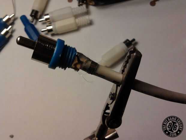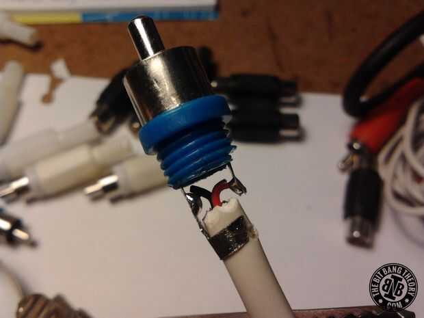 Soldar un conector RCA macho a los alambres del cable con el conector USB A VCC(red) y GND(black). Como regla general, siempre ponga la VCC en el pin central y el GND en el exterior. Después de soldar puede poner pegamento caliente sobre los cables para hacer el cable más fuerte.