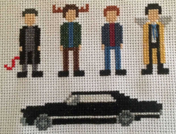 Dos patrones de punto de Cruz (en excel formulario) para una cruzada sobrenatural la puntada cuenta con equipo de libre albedrío (+ Crowley). El primero se muestra más arriba; el segundo modelo es una variante de Destiel.