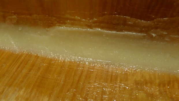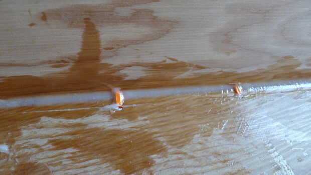 Nota que antes espesado epoxi se aplica siempre, primero debe "mojado" la superficie con epoxi cubriendo la zona de epoxy espesado. Usar su cepillo de epoxi para cubrir uniformemente la superficie y no te preocupes que en los amarres de cable.