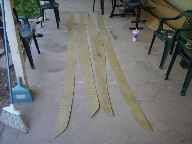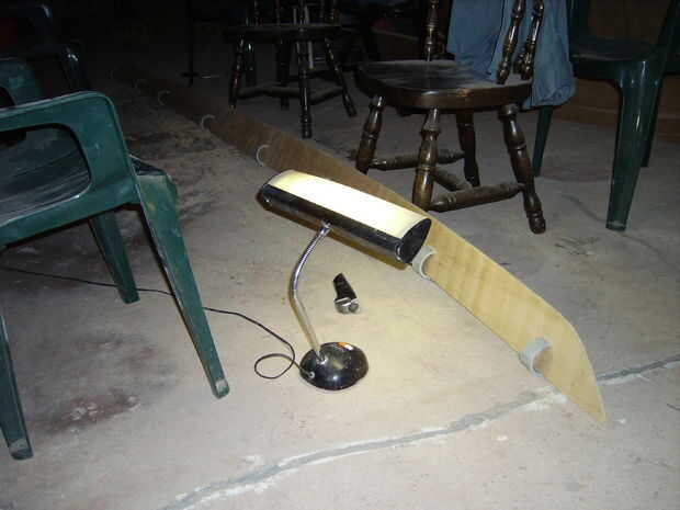 Una vez que los puntos se trazan hacia fuera sobre la madera contrachapada que es necesario utilizar algo flexible para dibujar entre los puntos. Es un borde recto que puede doblar. Creo que el proceso se denomina carenado con un listón. Utilicé una pieza recta fina del metal de hoja y para las curvas más usé un pedazo más pequeño de plástico. Es también ayuda a tener dos conjuntos adicionales de manos. En lugar de eso, usé unos ladrillos para mantener el listón en el lugar correcto.