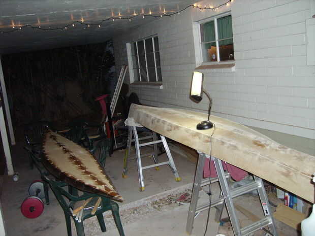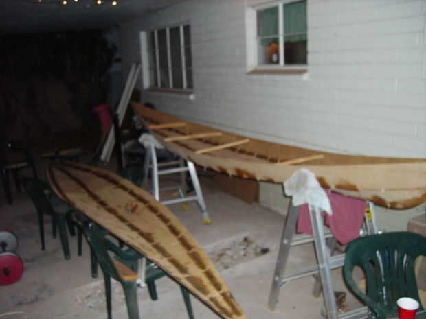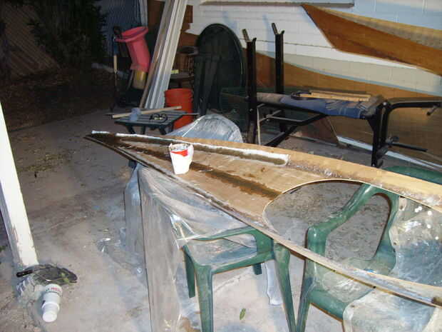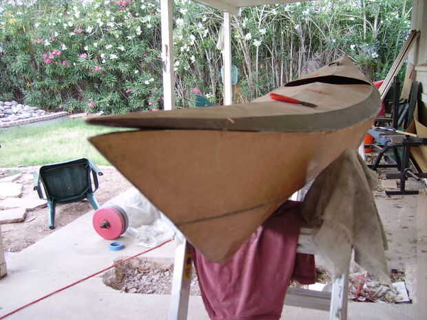 Cuando haya completado las secciones superior e inferior es hora para unir las dos mitades. Por desgracia no encajan. Es probablemente debido a las modificaciones al diseño o puede han cambiado forma cuando ambas partes se separaron, pero a pesar de todo tuve que se ajuste. El centro encajan simplemente bellas ya era capaz de coser con alambre de cobre y encolarla. Los extremos sin embargo no vendrían juntos, así que había añadido algunos pesos y puré los vacíos extremos juntos entonces cualquier relleno con epoxi espesado. La cubierta realmente sacó sobre una mitad de una pulgada sobre el borde de los extremos delanteros y traseros. Terminé recorte nuevamente la caída y poner epoxi espesado en los boquetes.