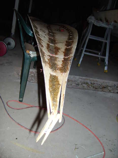 Ya que las costuras ya contienen epoxi espesado duro tenía arena suave. Al lijar epoxy Asegúrese que una máscara y protección ocular. Desde que trabajo fuera en el porche estaba ya en un área bien ventilada. En este punto también cortar hacia fuera de la cabina. Usé un par de cubos y borde recto para dibujar la forma de cabina curva quería. Otra técnica es atar una cuerda a un lápiz y dibujar el arco. Cuando parecía adecuado que recortar.