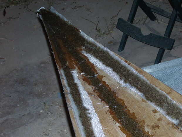 A continuación puede cinta o las costuras que es lo que hice, o puede de fibra de vidrio el interior del barco. Para las costuras de la cinta, he creado cinta ancha de fibra de vidrio de 3 pulgadas por cortar a la tela de 6 oz. de tiras de cualquier longitud que necesitaba. Una vez que se lija en el interior, añadí epoxi espesado más donde habían estado los cables y antes de que se secaba comenzó poniendo hacia fuera de la cinta de fibra de vidrio. Para mojar a la cinta sólo vierte un poco de epoxy en la cinta y extienda con un cepillo. También en este momento es una buena idea para pintar el interior con resina epóxica. Cuando el agua entra en el barco, la capa de epoxy para evitar que se dañe la madera.
