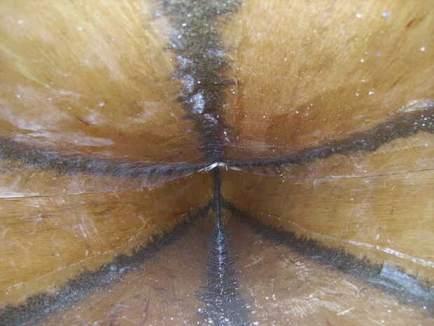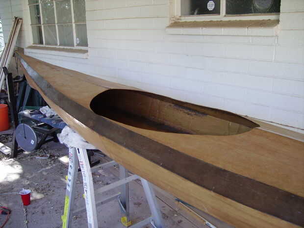 Después de curado del epoxy pude quitar las puntadas de lado. Llegar a la cabina era capaz cortar la mayoría de los cables. El resto de los cables que era capaz de resolver con unos alicates de punta. Grabar las finales dos costuras necesita ir en la cabina con un palo y una linterna y epoxi espesado en las costuras. Para entrar en los confines aunque hice algunos epoxi espesado un poco líquida y deje que caiga la costura por apuntalar el kayak en ángulo. Procede a la cinta. Esta vez moje la cinta previa de epoxi y rodó hacia abajo de la costura, empujando con un palo.