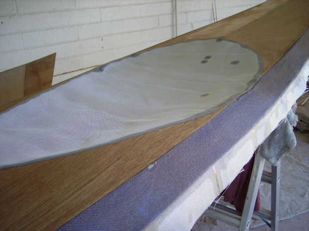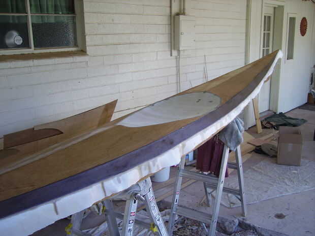 Primero pintar la parte inferior de la embarcación con epoxi. Esto permite que la madera de absorber algunas del epoxi y facilita la adherencia de soldadura a la tela de fibra de vidrio. También permite ver los defectos que más buscó. Entonces mientras que ha mojado todavía, cuelgue la tela de fibra de vidrio sobre el casco y mojado hacia fuera. Vierta el epoxi en barco y la extensión alrededor con un cepillo o con un separador de plástico. Una vez que el fondo está seco, cortar el exceso de fibra de vidrio, el borde de la arena, voltear el kayak y hacer la parte superior.