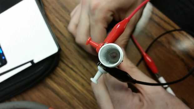 A) en el medio de la cámara, inserte las tachuelas de 90 grados una de otra pero aseguro que no se toquen los puntos o de lo contrario no crearse una chispa a través de los consejos.