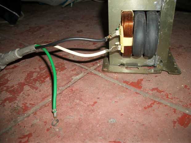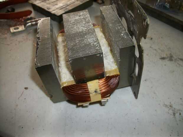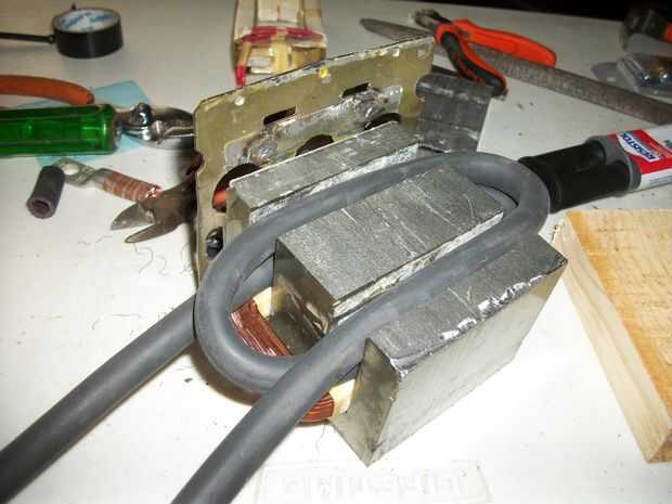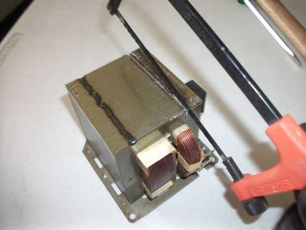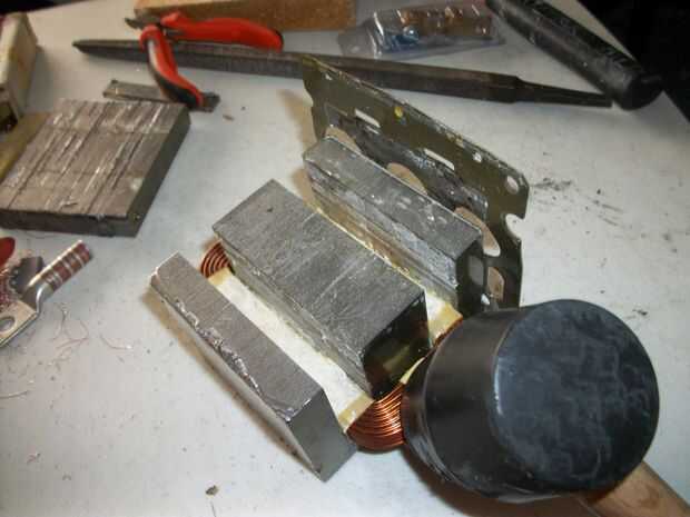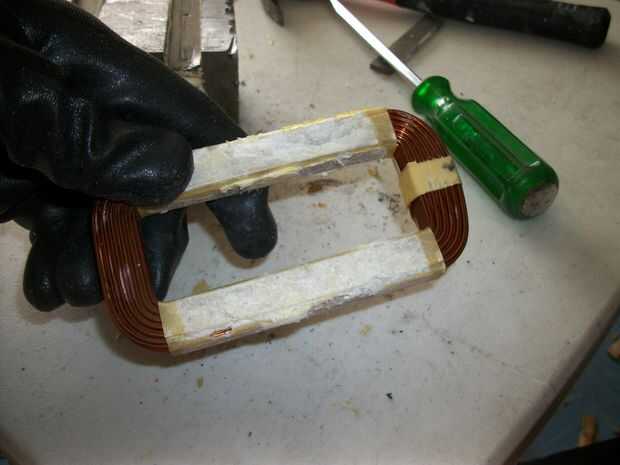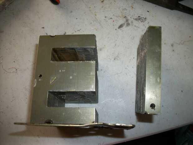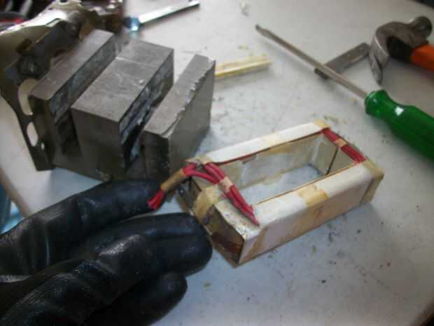 Lo primero debemos hacer es Sensory las partes del transformador. En la imagen se ve el bloque de hierro laminado y dos bobinas de alambre de cobre, una gruesa y una delgada. La gruesa es la toma primaria y es la saludando. Se puede ver las secciones del bloque están unidas con una delgada línea de soldadura.