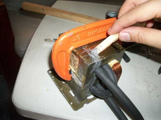 Al terminar tendremos dos piezas distintas con forma de "E" e "I". Es momento de armar el MOT de nuevo. Primero introducimos la toma primaria hasta el fondo de la pieza "E". Encima de eso vamos un calibre de montaje dos vueltas del cable 2. Después debemos volver a pegar las dos partes del bloque usando una buena cantidad del pegamento epóxico y una prensa para mantener las partes bajo presión. También fijamos las terminales de un cable de las puntas del. Una vez endurecido el pegamento podemos conectar el transformador usando las dos conexiones de la toma primaria. En mi caso usé el cable del microondas.
