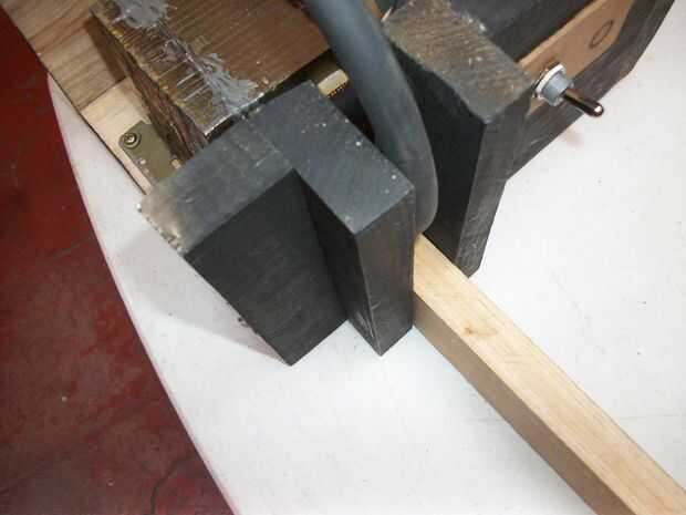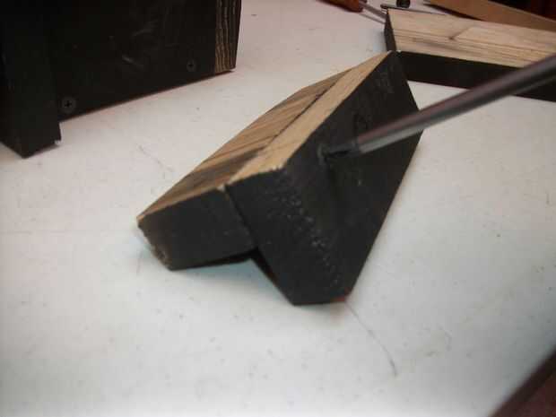 A continuación se atornilla uno de los soportes al Panel. Después unimos la pieza C y el otro soporte como muestra la imagen. Usamos una pieza de madera del mismo grosor usará en los brazos para medir la distancia entre los soportes y atornillamos la Pieza C a la base. Después cortamos un pedazo de la varita de 1,5 cm y la atornillamos entre los soportes como refuerzo. Por último atornillamos la pared una y le instalamos la manija.