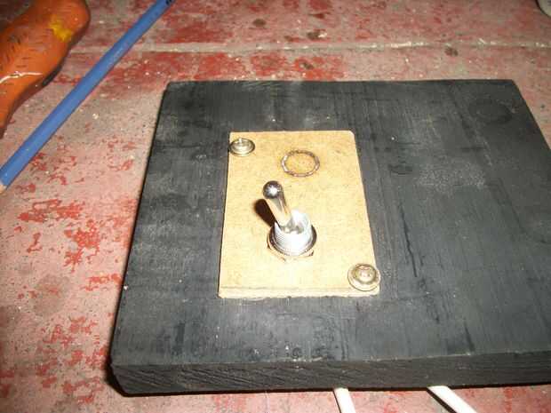 En los planos está el diagrama de un rectángulo pequeño de fibracel servirá para fijar el interruptor de palanca. Una vez cortado se instala el interruptor como muestran las imágenes y se fija la placa de fibracel al Panel con las pijas pequeñas. Después el Panel se atornilla a la Base y al costado B.
