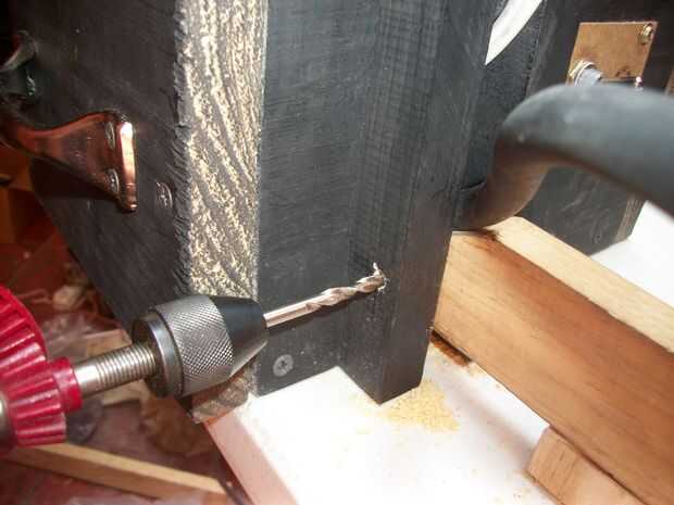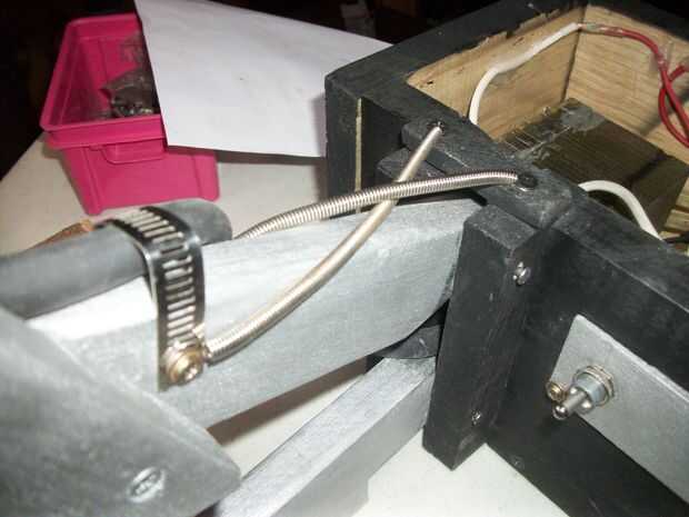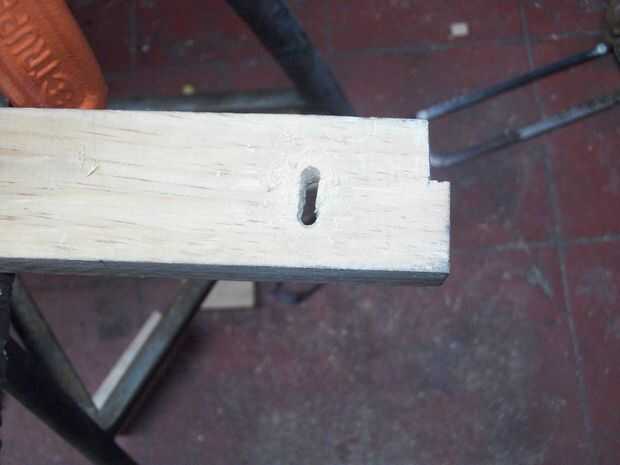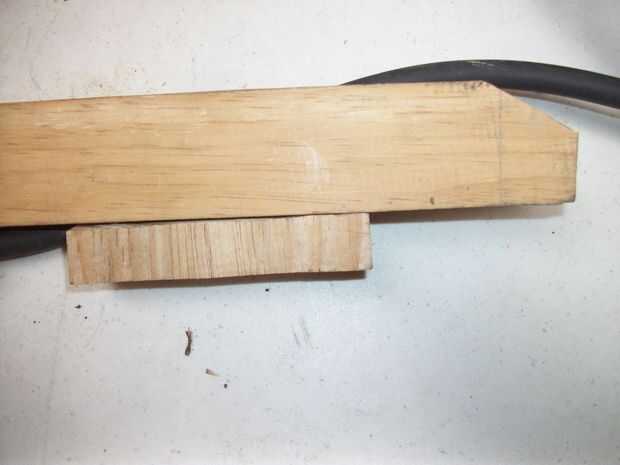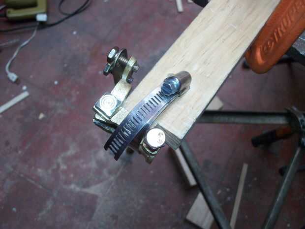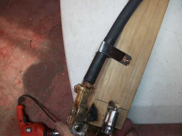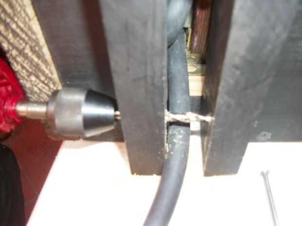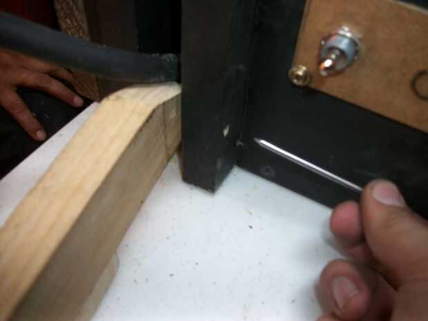 Para montar el brazo de abajo en los soportes de la punteadora lo introducimos aproximadamente una pulgada. De ser necesario cortamos un ángulo en el extremo del Brazo para no aplastar el cable. Después fijamos el cable a la terminal y cortamos una tira de una de las uniónes para con esta fijar el cable al Brazo. Usando algún sobrante de madera le añadimos una tira al Brazo por la parte de abajo para se apoye sobre esta tira. Para fijar el Brazo de abajo una a la caja debemos introducirlo entre los soportes y hacer una perforación atraviese el soporte, el brazo, y el otro soporte. La perforación debe permitir los clavos largos entren fácilmente. Por último introducimos un clavo largo para unir el Brazo a los soportes. Yo usé clavos de 3 pulgadas.