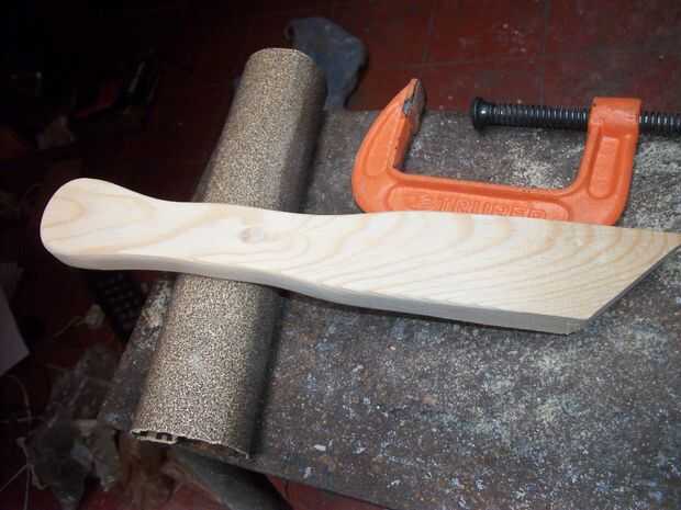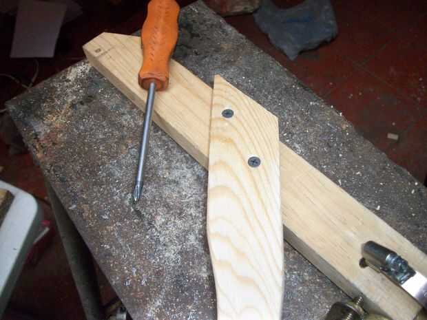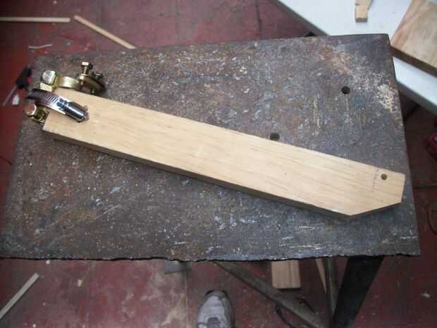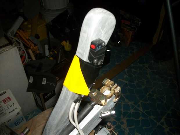 El Brazo superior tiene un armado similar pero lleva una palanca. Los planos de la palanca están a tamaño real y pueden ser cortados con una sierra caladora. La palanca se atornilla en la posición más cómoda para el usuario y se fija el cable. Se hacen los agujeros para el clavo y se ensambla el Brazo. Los electrodos se desarman para pintarse.
