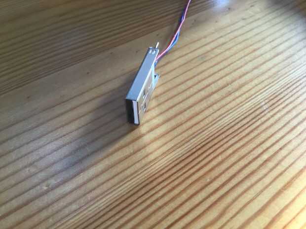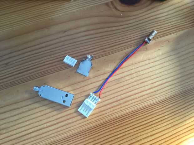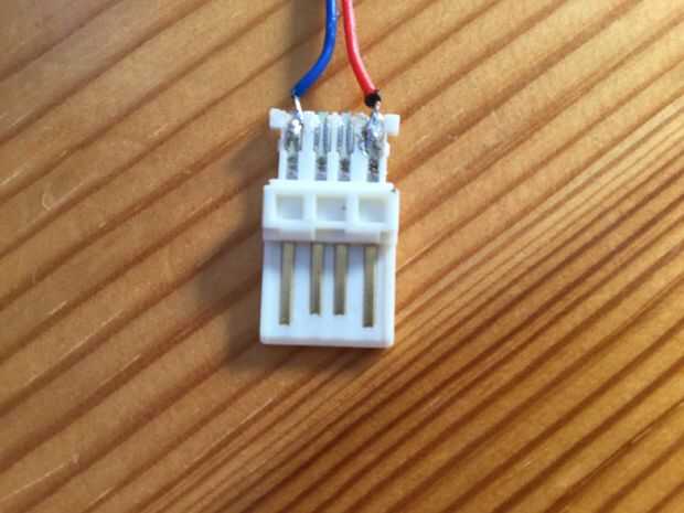 Soldar el cable rojo del diodo (+) al cable de la clavija 1 en el conector y el azul (o negro) al pin 4 (-) en el conector USB.
