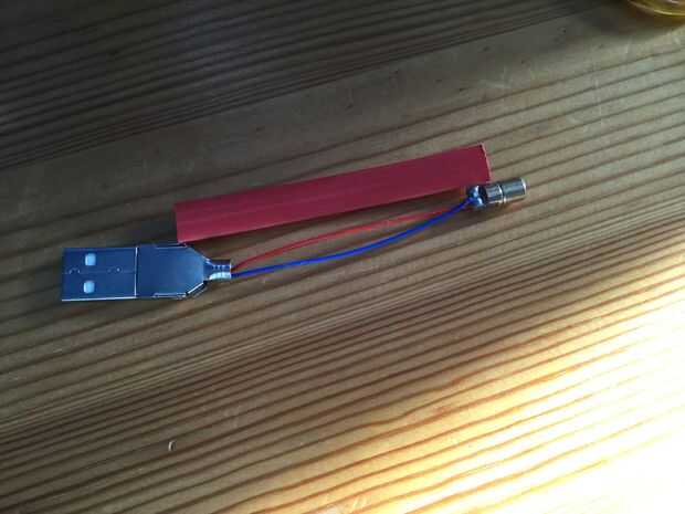Si usted hizo lo mismo que yo, tiene algo así como la primera imagen. Sólo puede Conecte a tu ordenador, haz un largo cable de extensión USB o para más movilidad, vaya para un powerbank. Sucede que tiene un par de ellos, que son bastante grandes. Ya que este diodo láser sólo dibuja una corriente de 0. 05A, podrás disfrutar de tu láser para días con una sola carga incluso con ~ 2000 mAh unos.