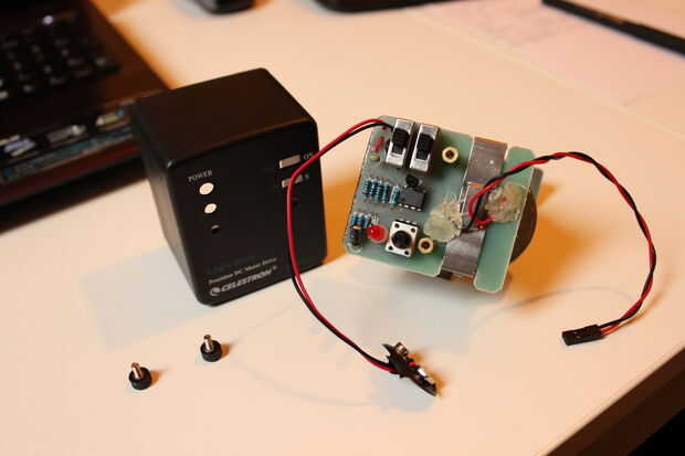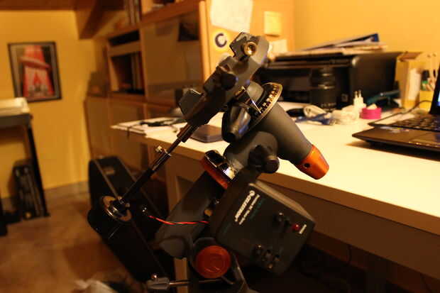 En primer lugar necesitas una montura Ecuatorial. Tengo de telescopio Celestron Astromaster 130 EQ-MD , viene con un motor de la C.C. para la compensación de movimiento aparente del cielo. Usted probablemente ha notado que uno hace no sólo para regular la velocidad correcta con el potenciómetro, por lo que su exposición de fotos no puede ser tan largo como quieras. Este telescopio es un modelo barato, por lo que en este momento voy a hacer una más precisa regulación de velocidad con Arduino PWM.