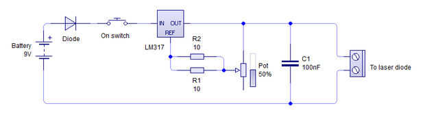 Las LM371 varían los usos del voltaje el LD (he cortado la parte superior debido a no se sobrecalientan, creo no afecta a la forma en que funciona), las resistencias de dos 10 ohmios en paralelo establece la tensión máxima y actual del diodo láser conseguirá, el pot permite el ajuste de corriente de salida, el diodo 1N4001 protege el LD de un negativo de entrada como batería a mal , pero el LM317 no puede entregar voltajes neative, así que tal vez no es necesario, y el condensador protege láser diodo de alimentación inmediata especialmente al encender.