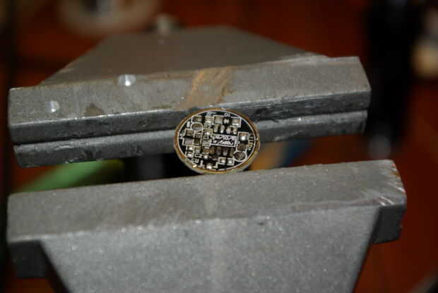 El regulador pequeño es necesario para conectar la batería. A quitar todos los componentes de itty bitty de alguna manera, solo utiliza un cuchillo pequeño y cuidadosamente les raspó lejos. Luego arriba necesitas saber donde se puede encontrar energía. Sólo tienes que buscar alrededor con un multímetro hasta encontrar un punto que conecta al anillo por el regulador y otro que conecta con el "botón" por debajo y dos cables cortos que les de la soldadura.