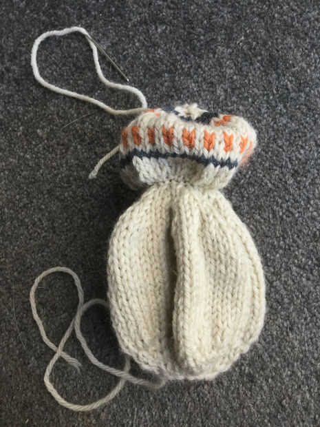 Repetición en cada aguja en 1 rotación: deslizamiento 1, tejer 2 juntos, pasar la puntada de resbalón. Ahora tienes 1 punto por aguja. Corte el hilado con unos 20 cm de cola. Hilo de rosca los restantes 4 puntos juntos y tire firmemente. Coser por la parte superior de la cabeza del BB-8. Él se rellena desde la parte inferior.