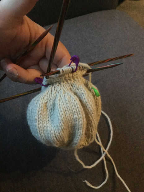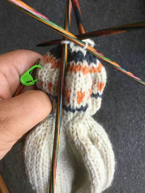En gris, en cada aguja repetir: tejer 2 juntos, punto 1, punto 2 a, punto 1, tejer 2 juntos. Esto bajará de 8 a 5 puntadas restantes
