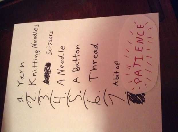 Lo que tienes que hacer esto - 1. Hilo (cualquier color funcionará.) 2. agujas (no importa tamaño pero uso US8 5. 0mm.) 3. tijeras (mejor utilizar tijeras de costura, o tijeras regulares que pueden cortar el hilo fácilmente.) 4. una aguja (uno.) 5. un botón 6. Hilo de rosca (cualquier color está bien pero se ve mejor si utilizas el mismo color como tu hilo). 7. un poco de paciencia (esto puede tomar más de 3 horas para hacer).