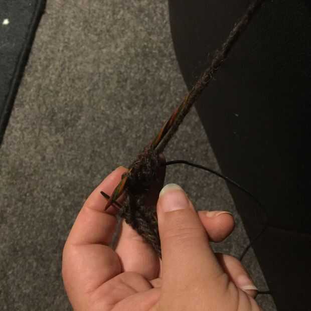 Tejer 2 juntos durante toda la hilera. Al final de la fila, tomar la cola del hilo y enróllelo alrededor de los 4 (5) firmemente las puntadas.