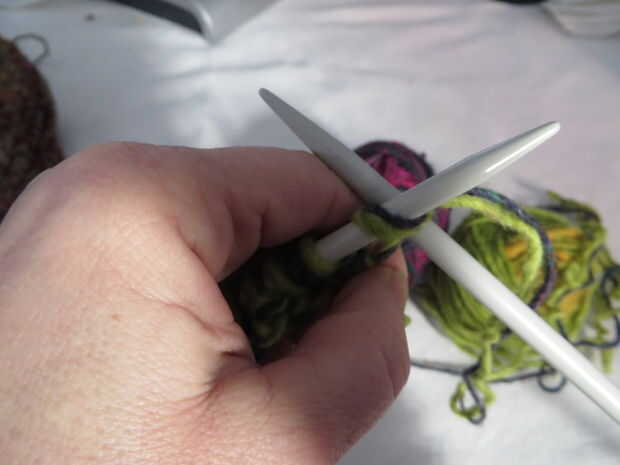 Establecer el patrón del knit de la costilla: tejer 1 punto, 1 revés puntada hasta llegar al final de la fila.