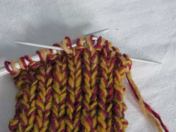 Luego tomar la lana detrás de los puntos de sutura en la aguja del cable con la misma cantidad de tensión que se emplean para "tejer normal" * y completar el resto de la fila en el patrón de costilla: 1 revés, punto 1, al final de la fila. No gire su punto - esta fila aún no está realmente terminada.