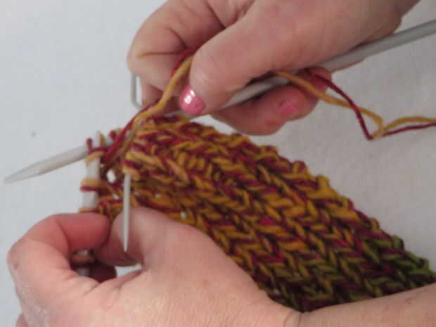 Con su punto frente a usted, que comenzar la fila siguiente y completar los puntos en orden, pero para esta fila y todas las filas subsiguientes, el patrón de costilla será 1 revés, 1 punto.