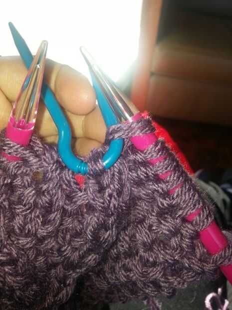Subir la aguja del cable e inserte su aguja de tejer en la primera puntada. Punto y saque la puntada de punto de la aguja del cable. Repita con la siguiente puntada en la aguja del cable.