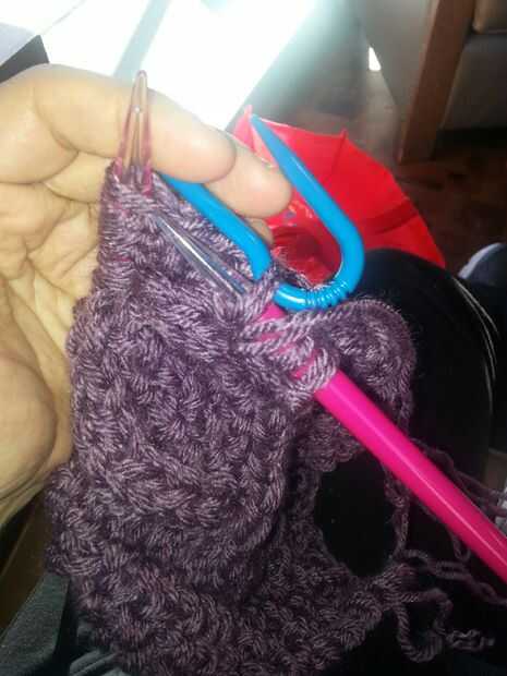 Tire de la aguja del cable hacia arriba y perl la puntada en la aguja del cable. Saque la aguja del cable.