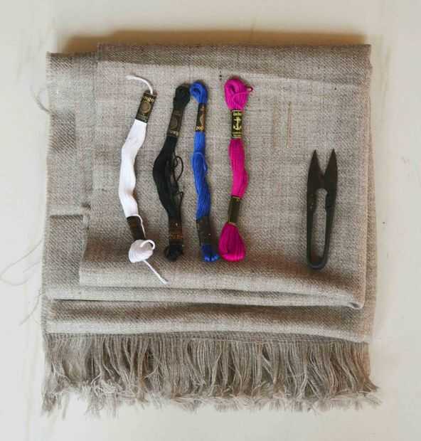 A robó / mantón, hilos de bordado de colores diferentes, una aguja, una recortadora de hilo / tijeras.