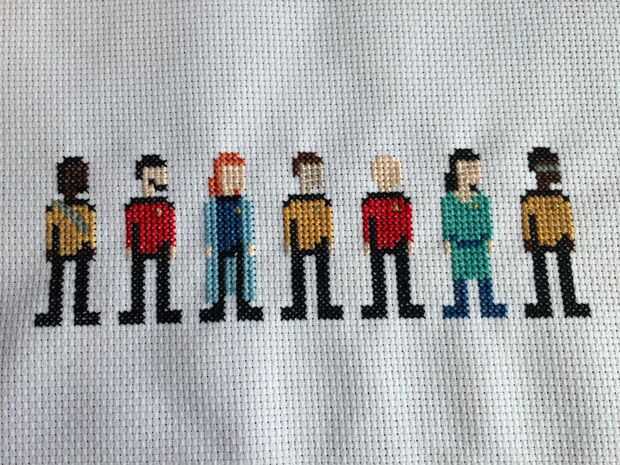 Punto de cruz patrón (en excel y forma del cuadro) para seleccionar equipo de Star Trek.Paso 1:Paño de Aida 14 Conde (patrón escrito para un marco de 5 x 7")Colores (número de color de seda estándar dado)** Todos **Pantalones, zapatos, collar - negro