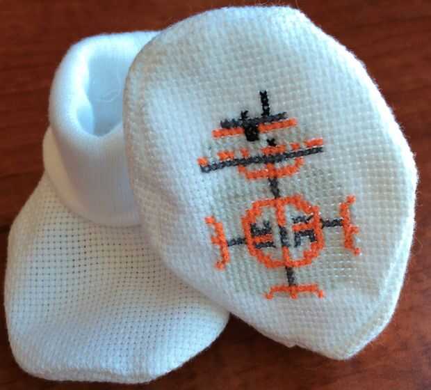 Punto de cruz patrón (en excel y forma del cuadro) con el BB-8, R2-D2 y C-3PO de Star Wars. Los botines fueron comprados de Jo-Ann tela. El diseño se podría hacer también en una tela plana normal.