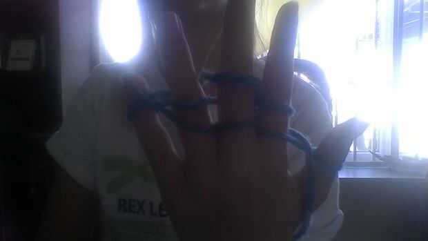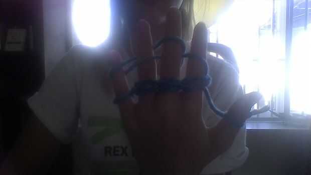 Tire del lazo inferior en su meñique (o lo que dedo es el último) sobre la punta de lo dedos, repita con los otros dedos. Repita los pasos 1 y 2 hasta que esté todo el tiempo que desea.