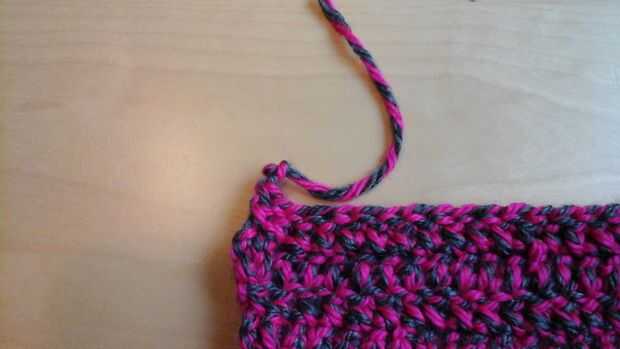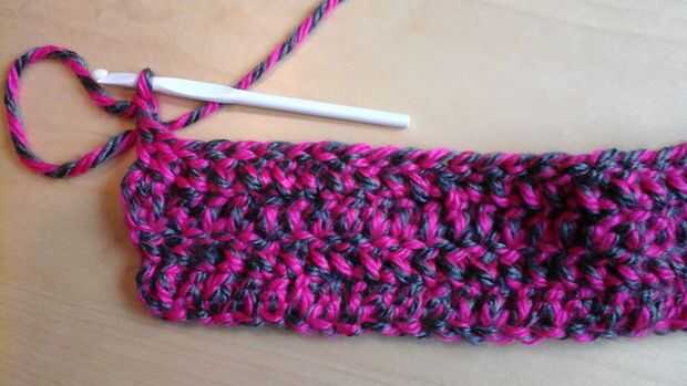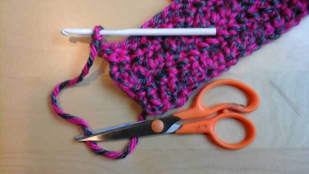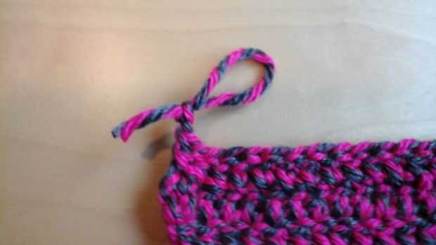 Doble crochet el resto de la fila cuatro Necesita la cabeza más que por lo menos 3 pulgadas de ancho Al final, Cadena 2 corte cuatro pulgadas de la última cadena y tire la cadena del gancho hasta que anuda
