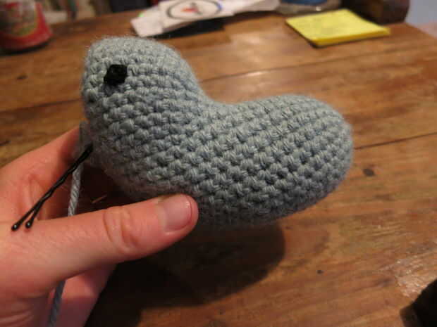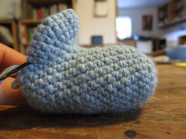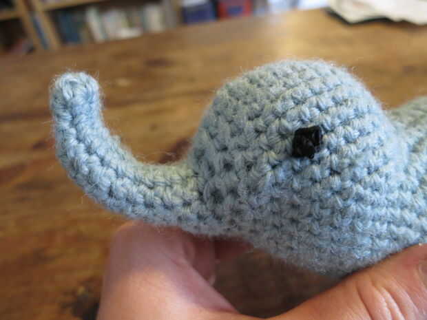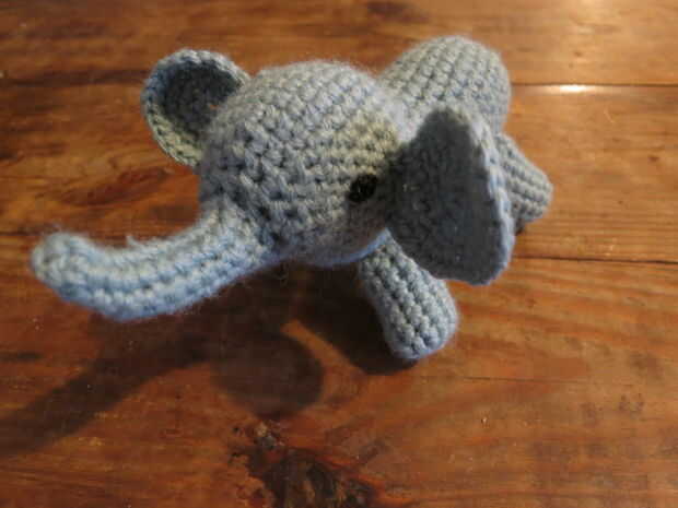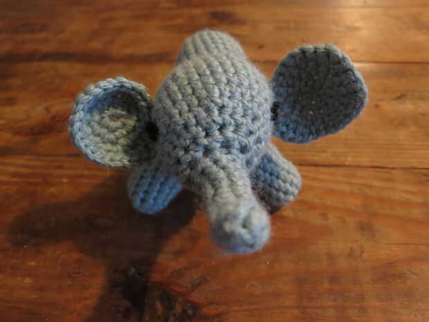 Para montar el elefante usaba una aguja de gancho grande de plástico. En primer lugar, coser las orejas al lado de la cabeza de elefante. La colocación depende de usted, pero me centré las orejas detrás de los ojos. Luego, coser las patas rellenas a la parte inferior del elefante. Traté de espaciar las piernas uniformemente por lo que el elefante sería capaz de hacer frente. Por último, coser la cola al final del cuerpo. Como acabado de atar fuera de todas las partes del cuerpo, ocultar los extremos de la lana en el cuerpo del elefante.