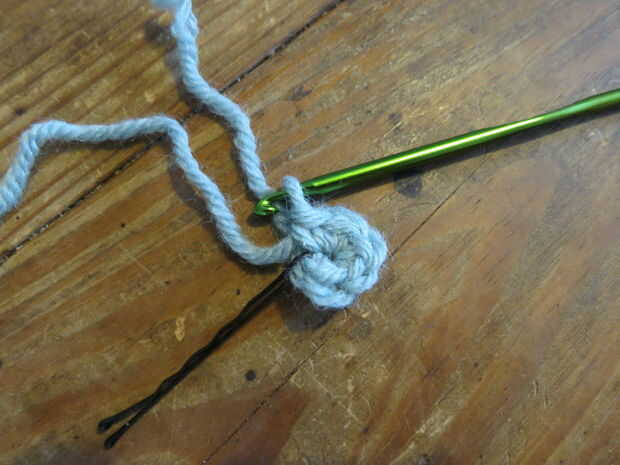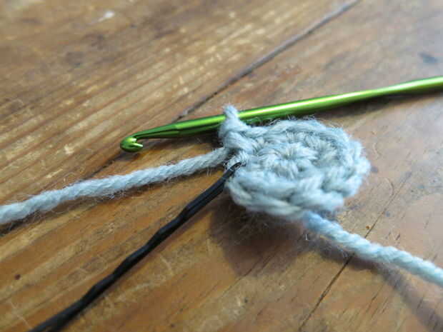 Ronda 1: Trabajo 6 sc en 2 ch de gancho. Colocar marcador (en mi caso una horquilla) en el sc 6, marcando el inicio de la próxima ronda. Mueva el marcador hacia arriba como cada ronda se ha completado.