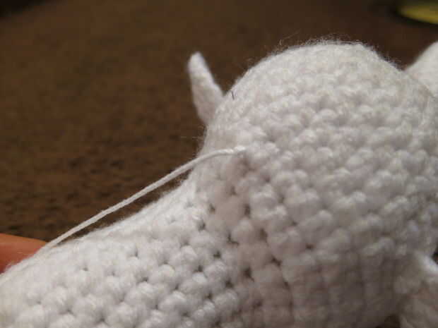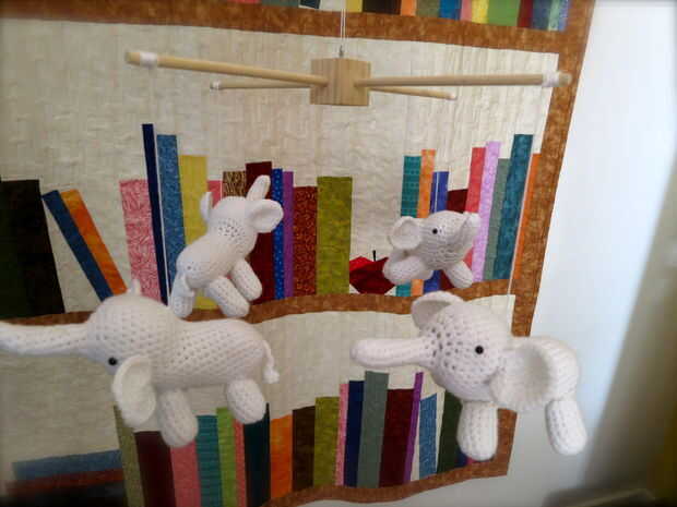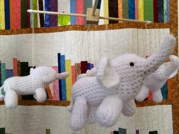 En primer lugar, ató el hilo a cada elefante en la parte posterior de su cuello. Elegí este lugar en el elefante porque permitió a los elefantes colgar recto, no inclinado hacia arriba o hacia abajo. He intentado atar el hilo a cada elefante en el mismo lugar así que cuelgan uniformemente. También me escondí al final de la rosca interior del elefante por lo que sería un ojo dolorido.