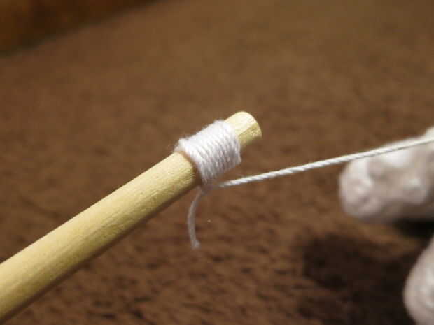 Corté cuatro piezas del hilo de ganchillo de algodón aproximadamente 2 pies de largo. Les corté demasiado largo así que sería fácil trabajar con.