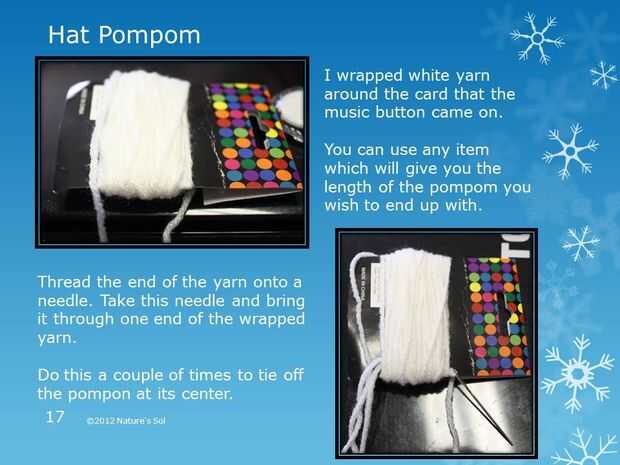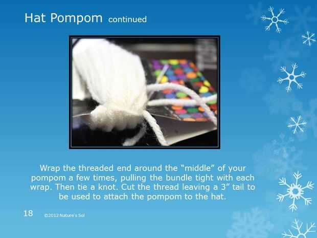 Envuelva el extremo roscado alrededor de los "media" de tu pompón unas cuantas veces, tirando el paquete firmemente con cada envoltura. Entonces haga un nudo. Corte el hilo dejando una cola de 3" a ser utilizado para fijar el pompón al sombrero.