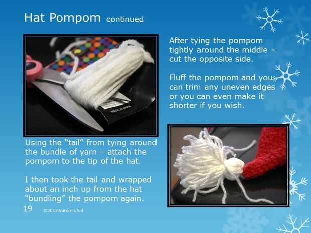 Con la "cola" de atar todo el paquete de hilado – Coloque el pompón en la punta del sombrero.